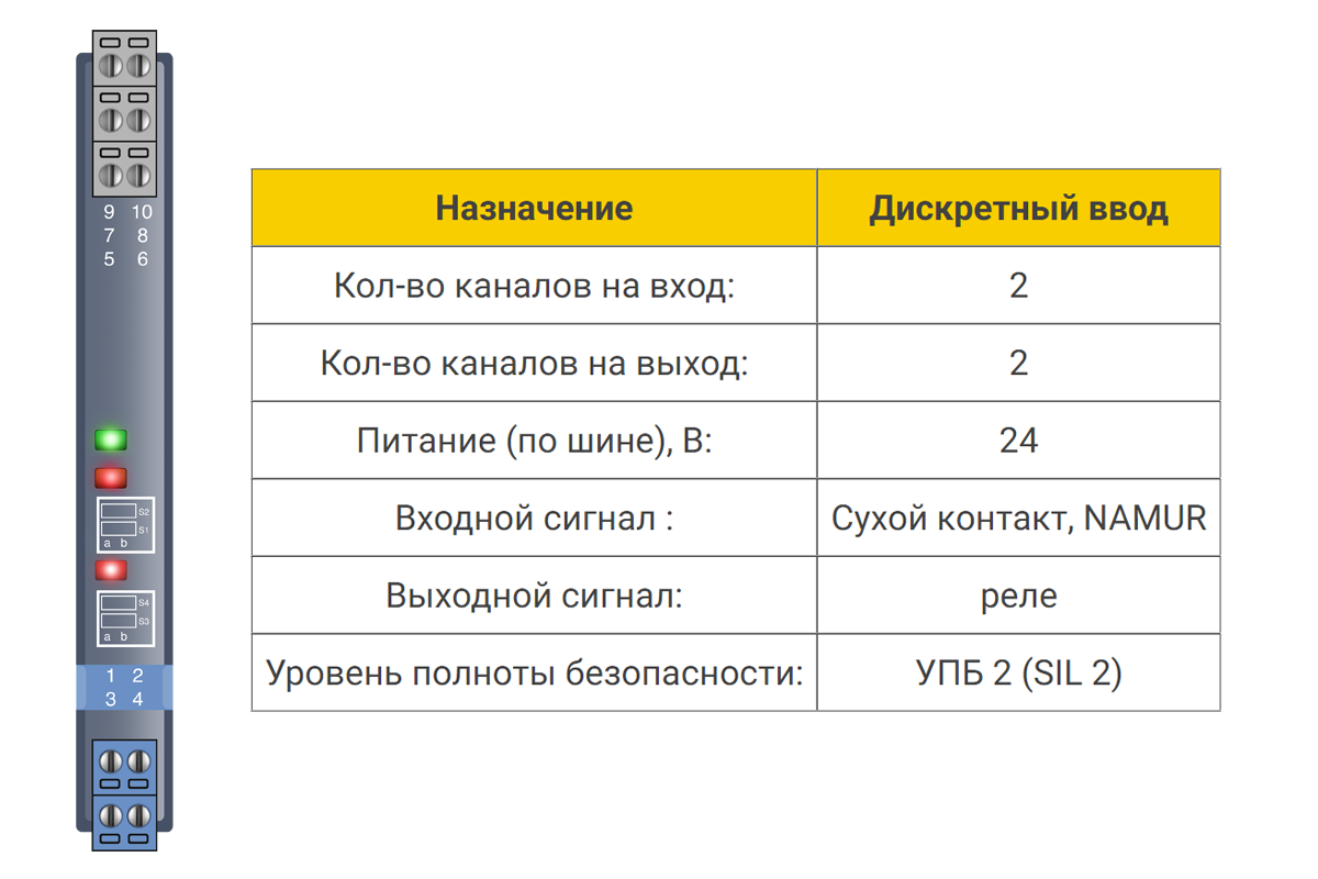 Барьер искрозащиты БИГ-2-1-22 2хDI (NAMUR, СК (сухой контакт)), SIL2