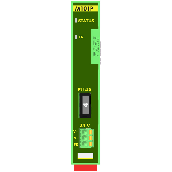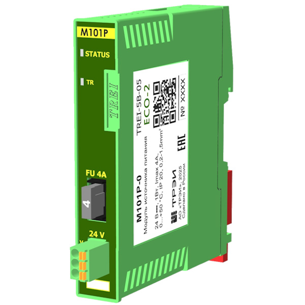 Модуль источника питания M101P предназначен для подачи напряжения питания постоянного тока на линейку модулей серии ECO-2. Модуль занимает последнее позиционное место в цепочке модулей серии ECO-2 при установке на DIN-рейку