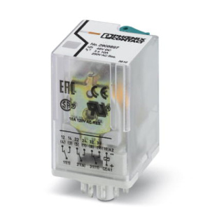 Вставные октальные реле с силовыми контактами, 3 перекл. контакта, тестовая кнопка, безынерционный диод, мех. индикатор коммутационного полож., полярность A1+, A2-, входное напр.: 48 В DC
